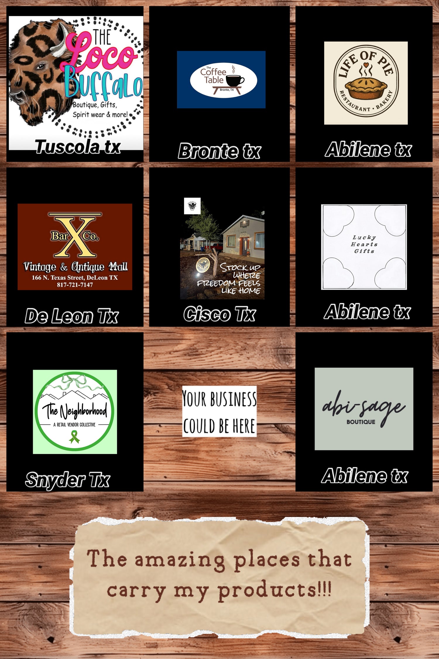 All the wonderful places that carry my products!! Message us about carrying our products!
